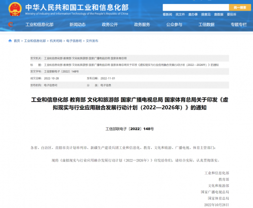 11月1日,工信部官网发布了工业和信息化部、教育部、文化和旅游部、国家广播电视总局、国家体育总局联合编制的《虚拟现实与行业应用融合发展行动计划(2022-2026年)》(以下简称《行动计划》)。